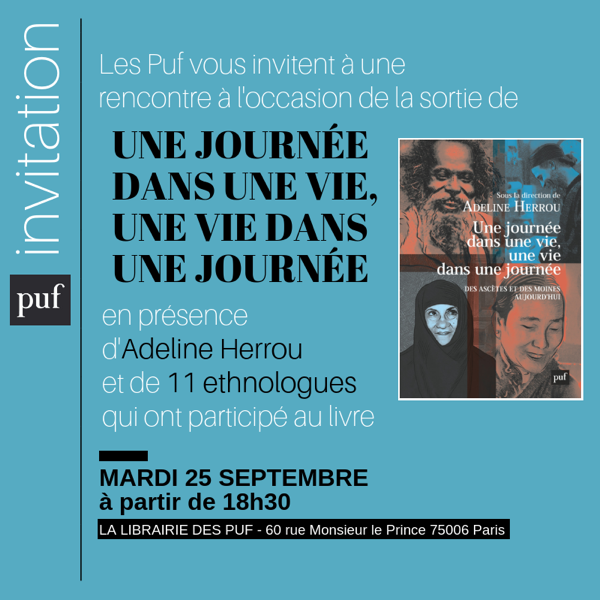 Invitation pour la rencontre autour de la sortie de l’ouvrage : Une journée dans une vie, une vie dans une journée. Des ascètes et des moines aujourd’hui, en présence d’Adeline Herrou. En présence également de Bénédicte Brac de la Perrière, Michel Boivin, Véronique Bouillier, Catherine Choron-Baix, Séverine Gabry-Thienpont, Florence Galmiche, Marie-Claude Mahias, Anna Poujeau, Nicola Schneider, Raphaël Voix… Et de l’illustrateur Frédéric Desportes. Le mardi 25 septembre 2018 à partir de 18:30 à la Librairie des PUF, 60 rue Monsieur le Prince 75006 Paris.